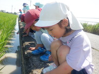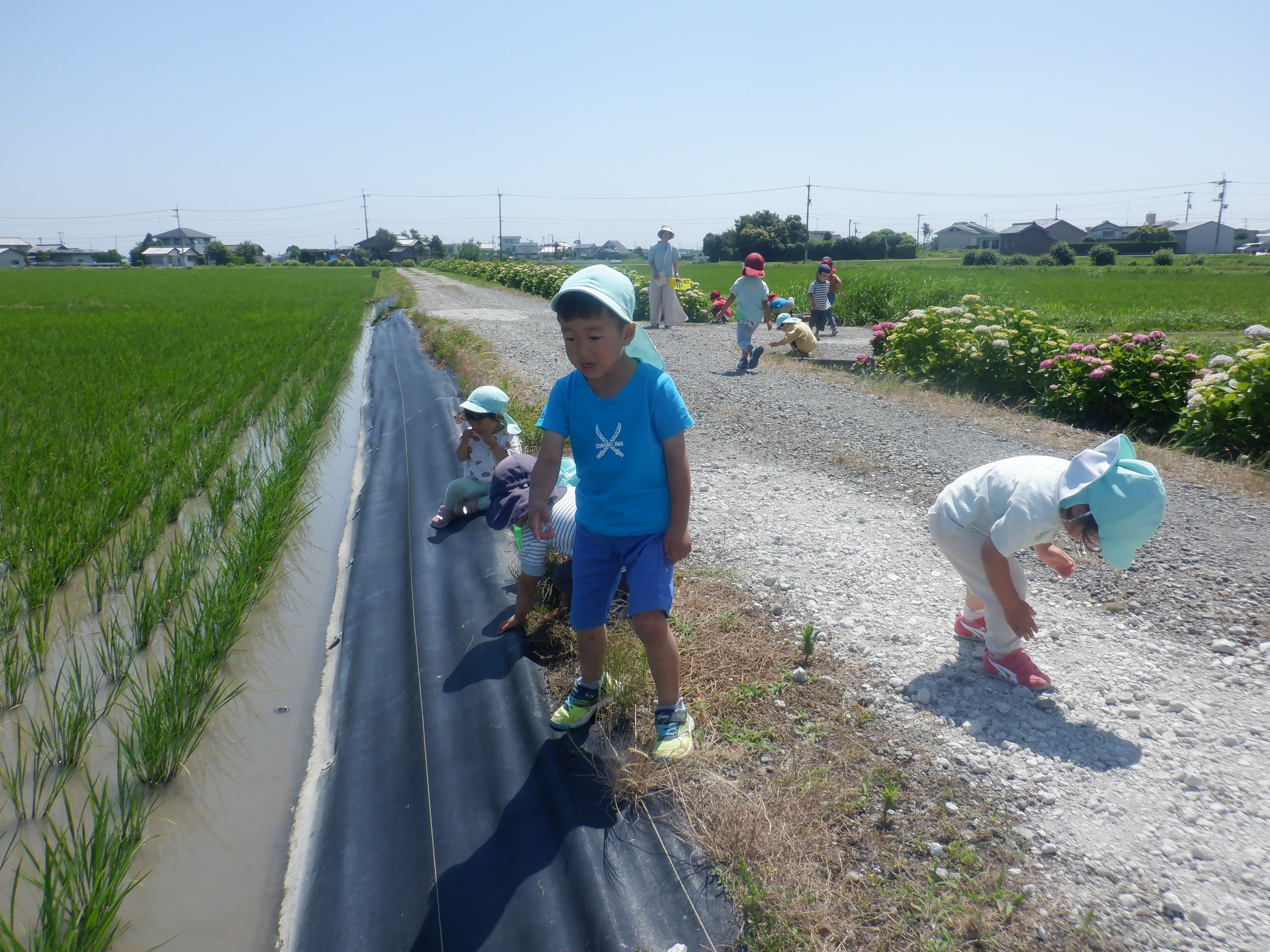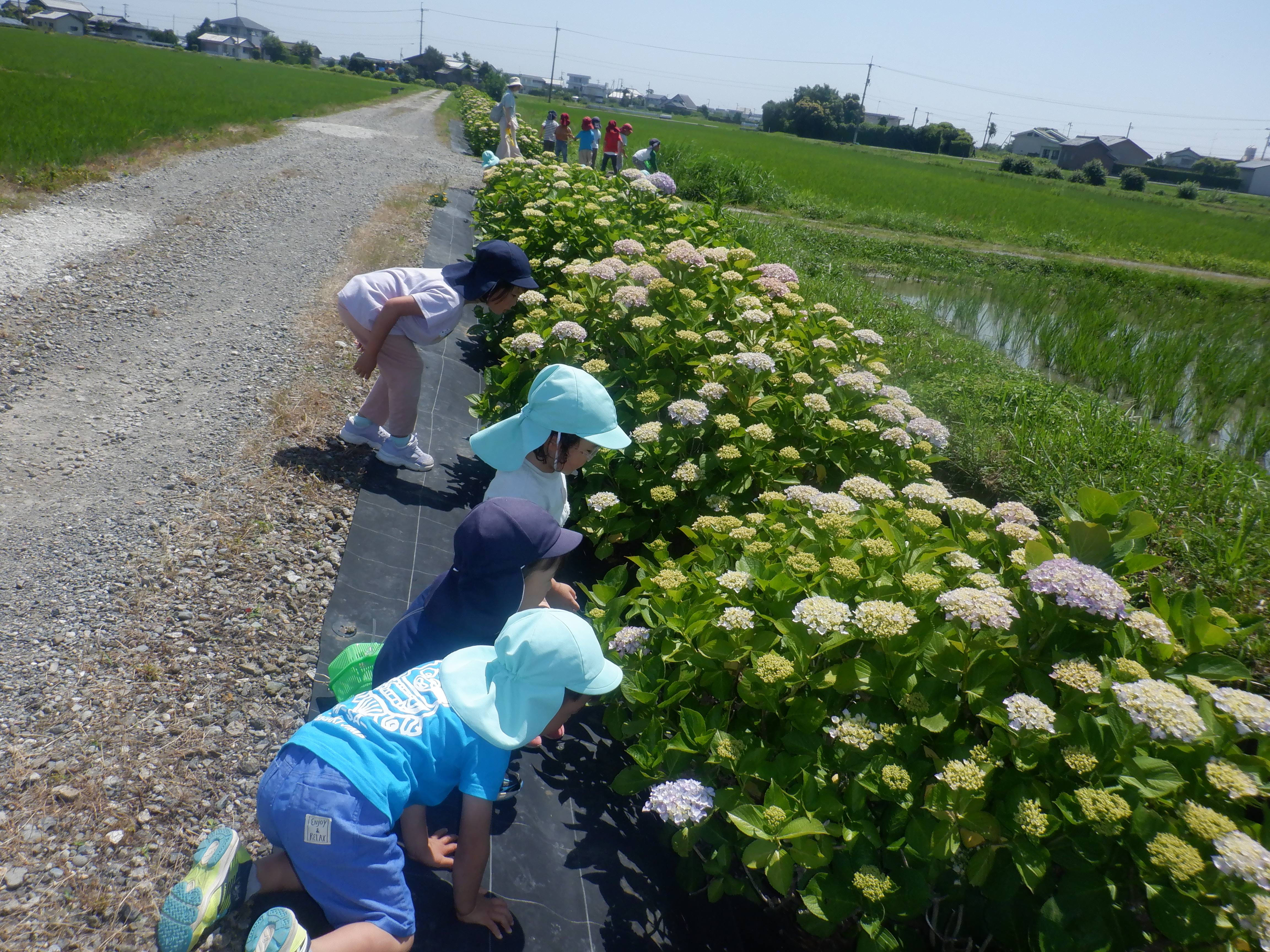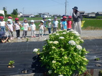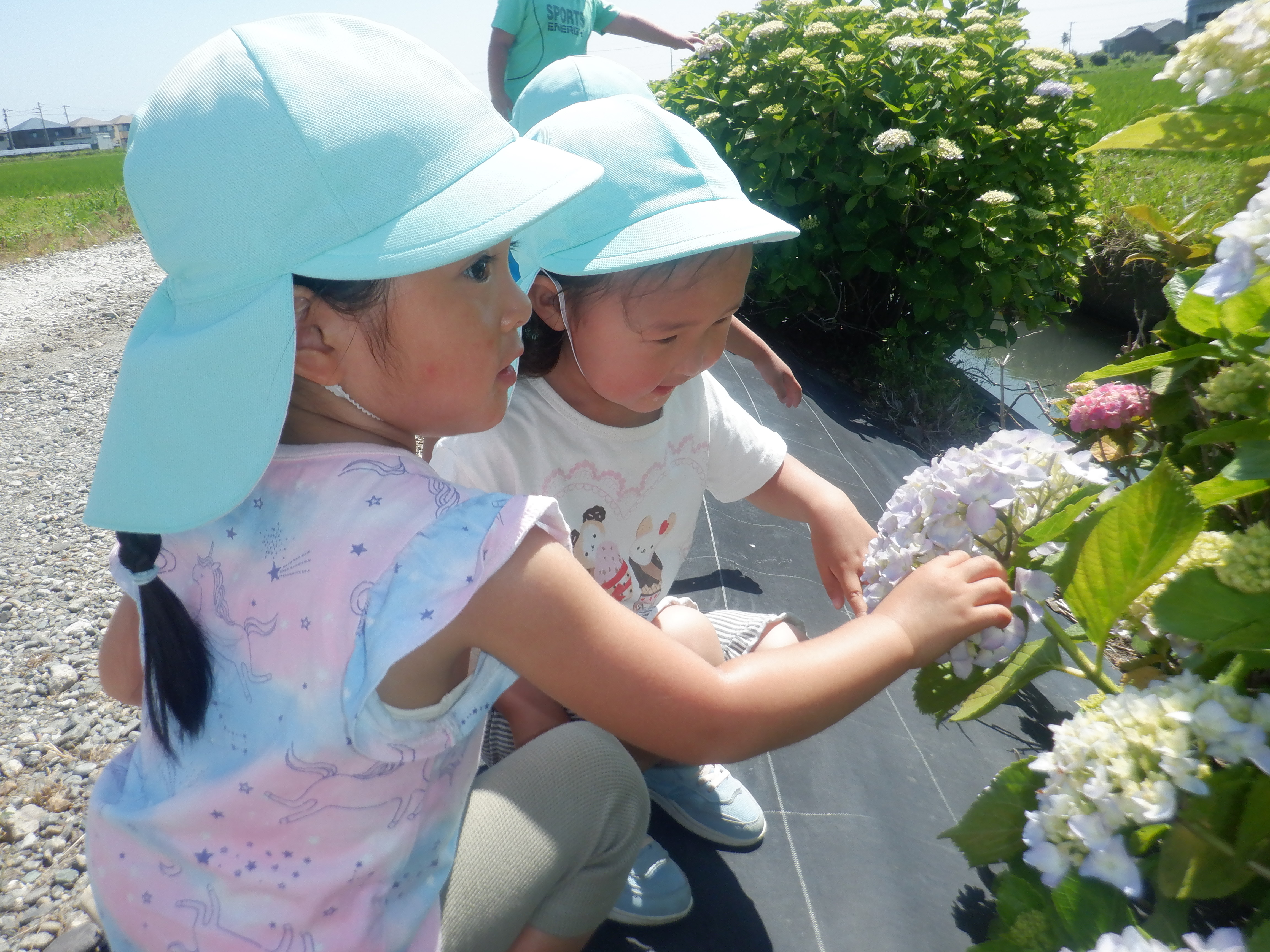 “アジサイの道”に散歩に行きました。「ピンク可愛い。」「青もある!」と、色んな色の紫陽花に触れることができました。近くの田んぼで、カエルやオタマジャクシ、アメンボやタニシを発見。泳いだり動いたりするのを友だちと一緒に観察していました。