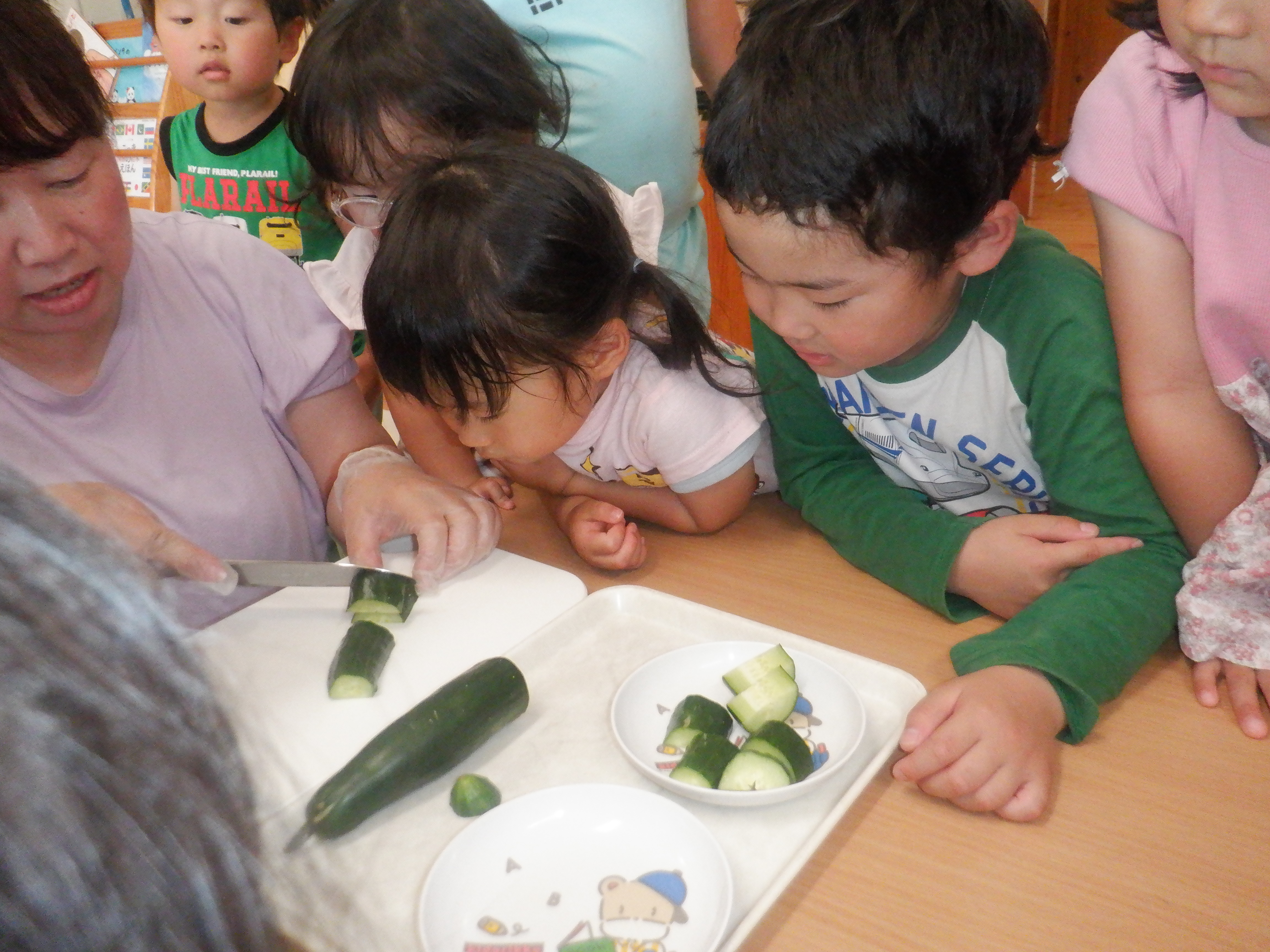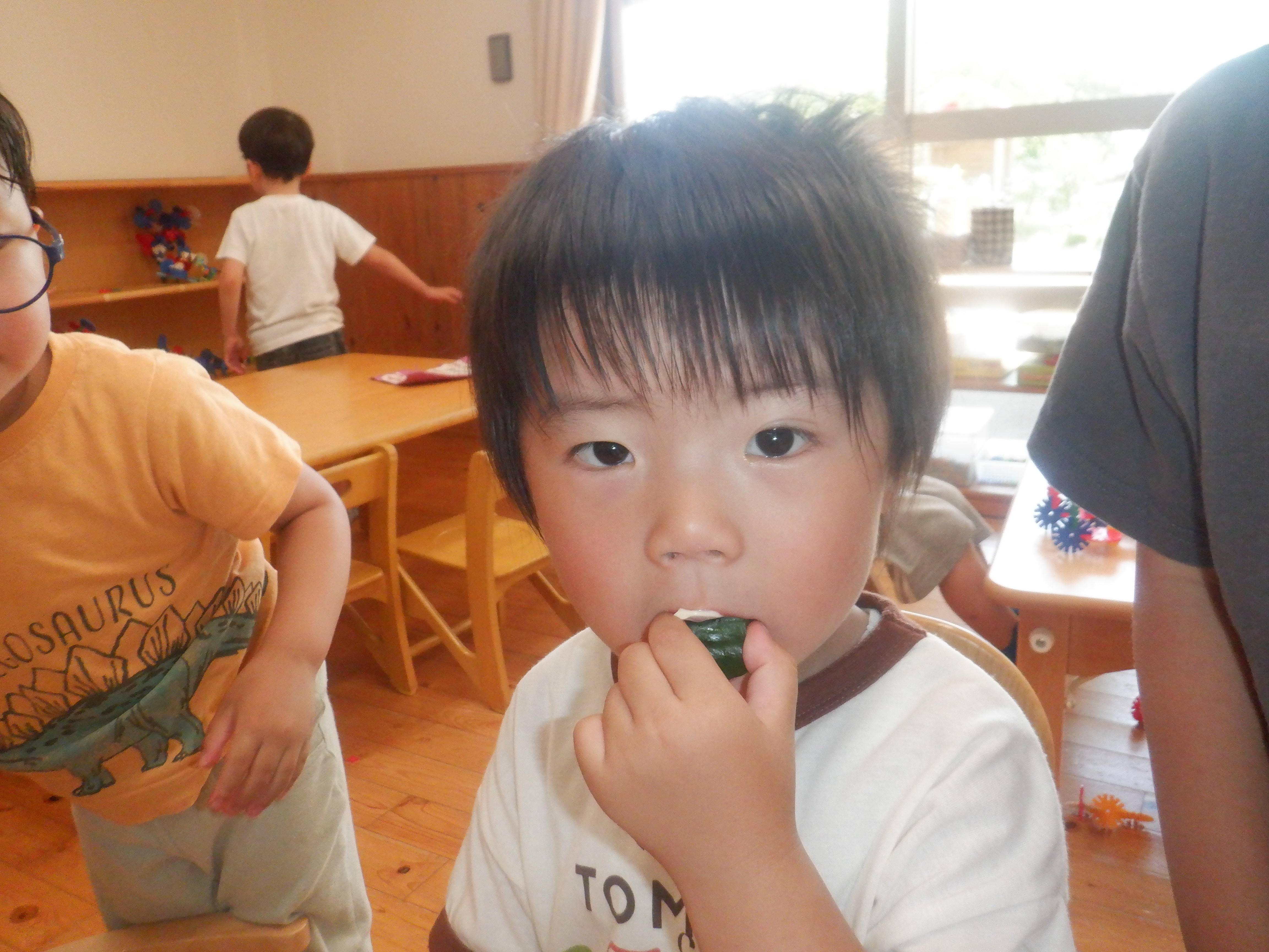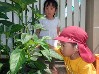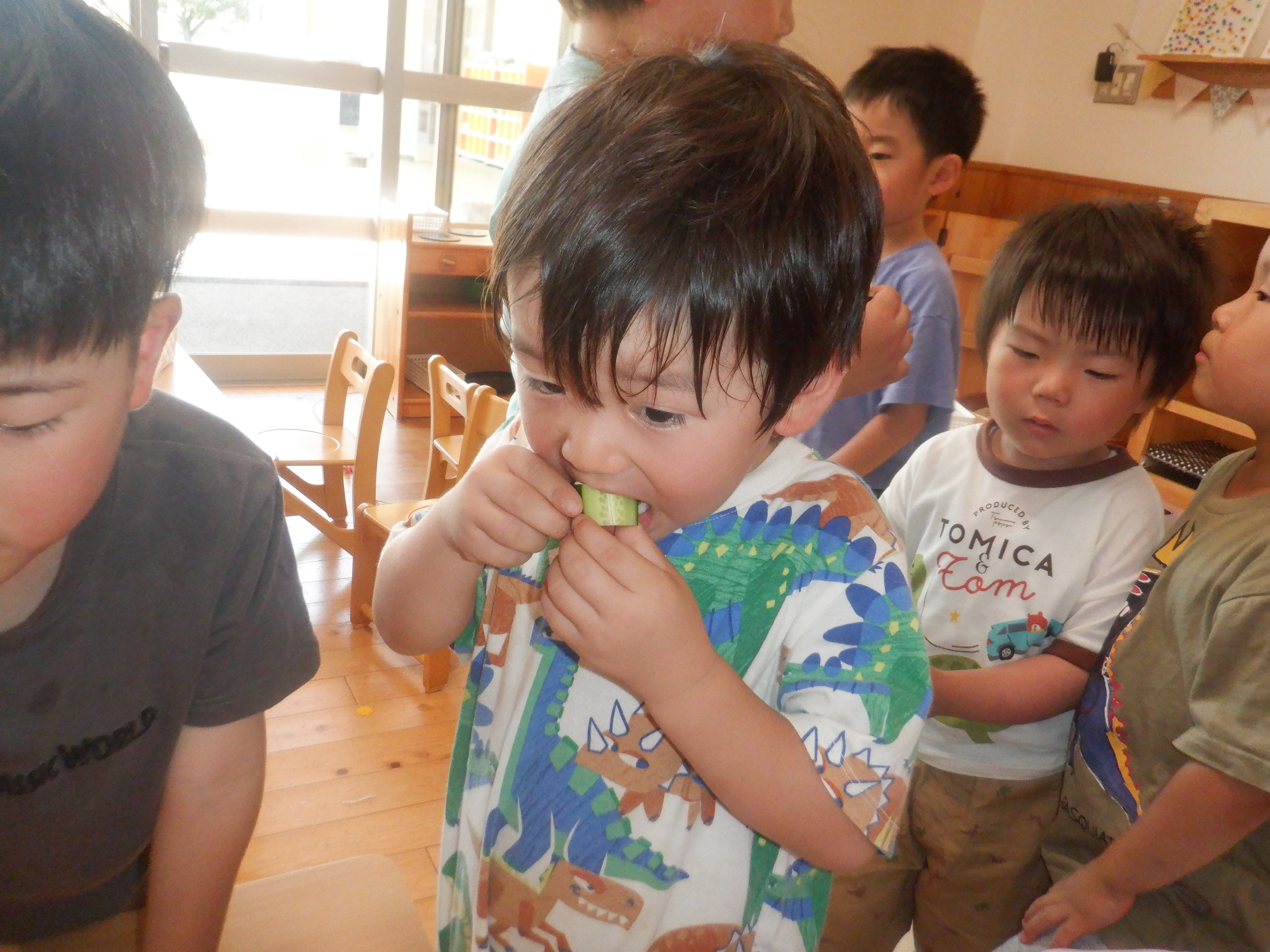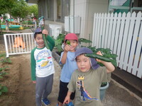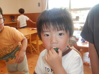長いキュウリができたので、オリーブぐみのみんなで早速食べてみました。「甘いなぁ。」「おいしい。」「(苦手だけど)ちょっと食べれた。」など、色んな感想を話していました。水やりのお世話をするたび、「また、食べたいな。」「そろそろかな?」と、夏野菜の成長の様子を見ています。