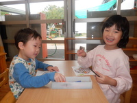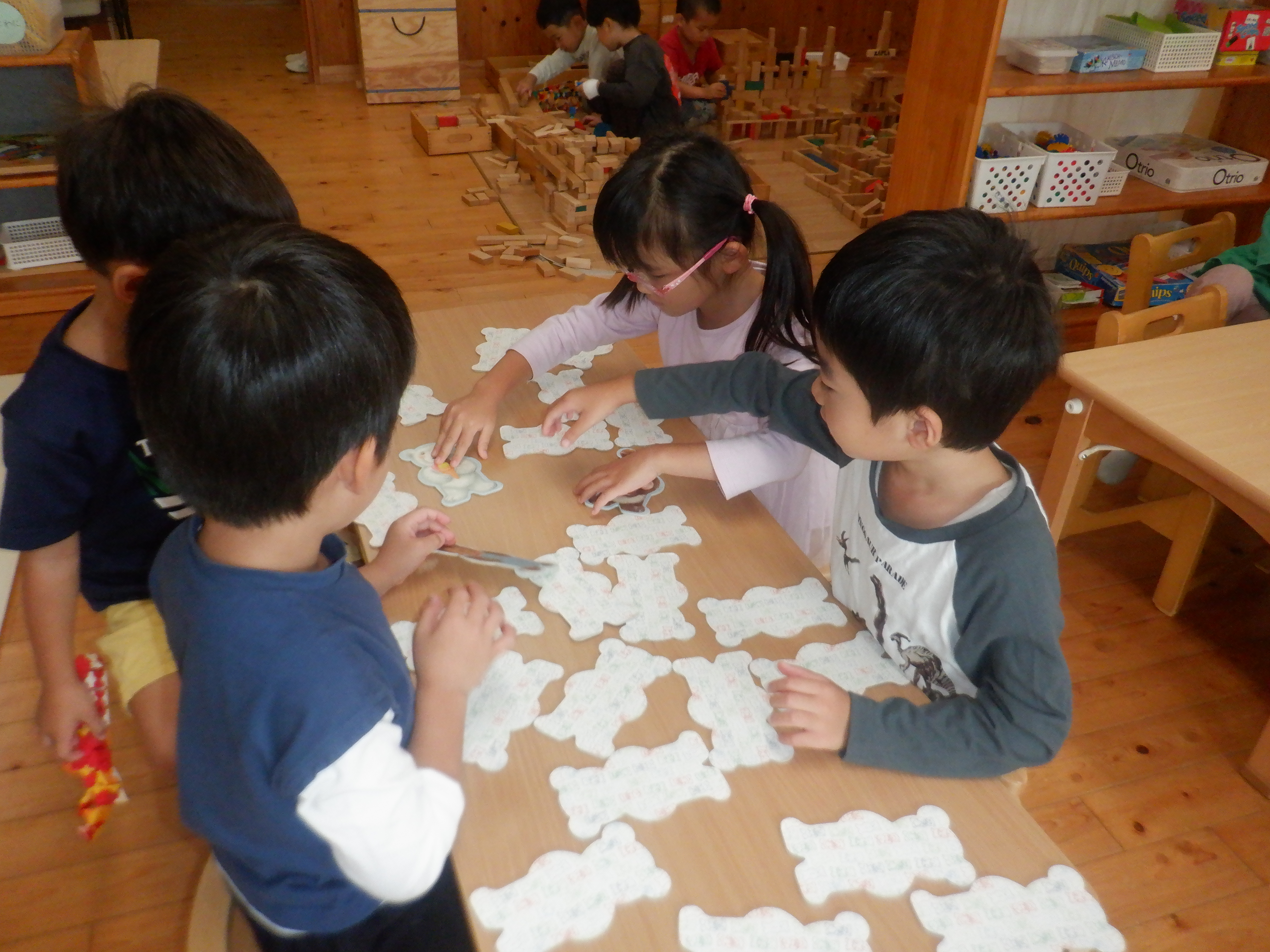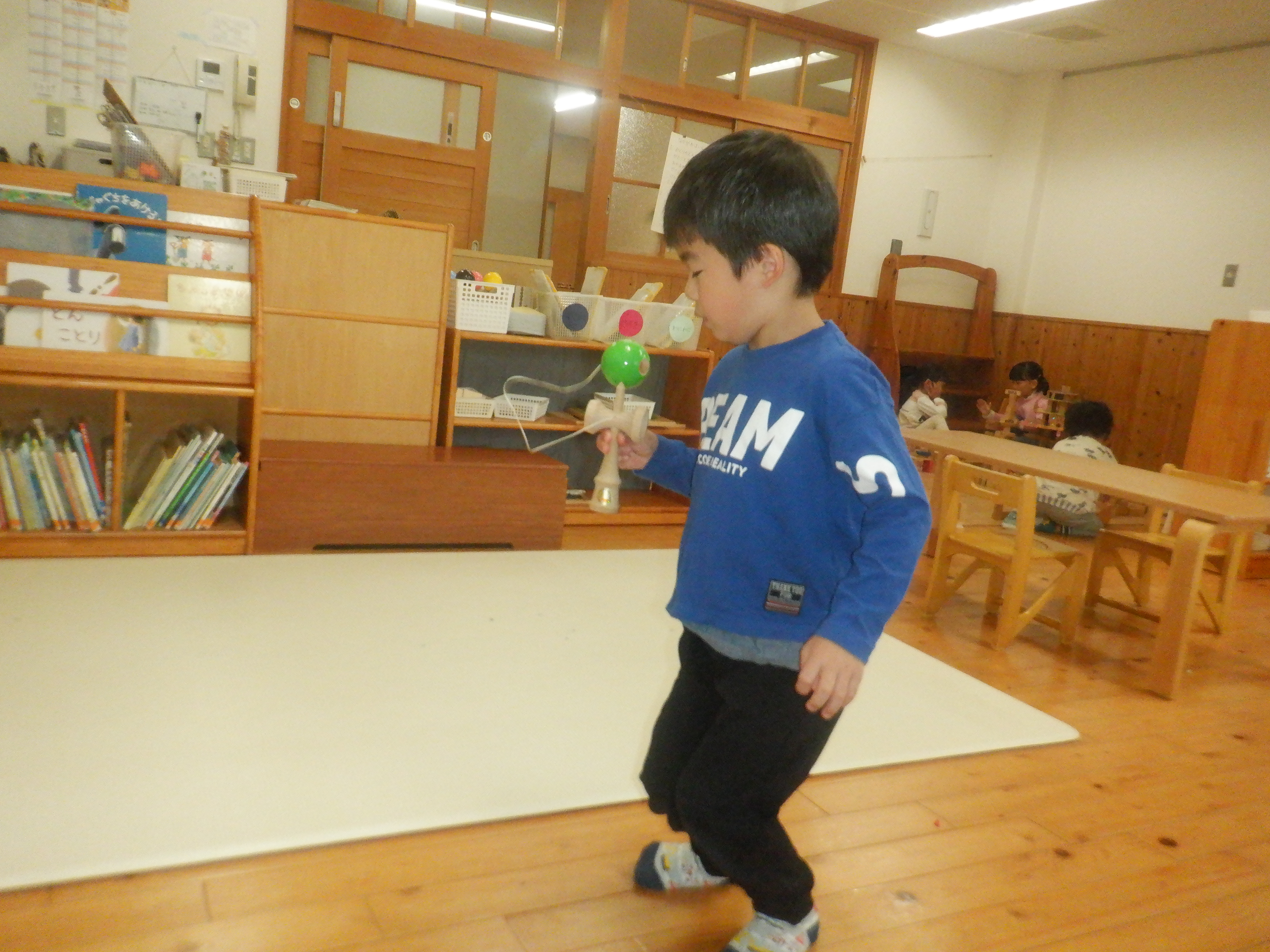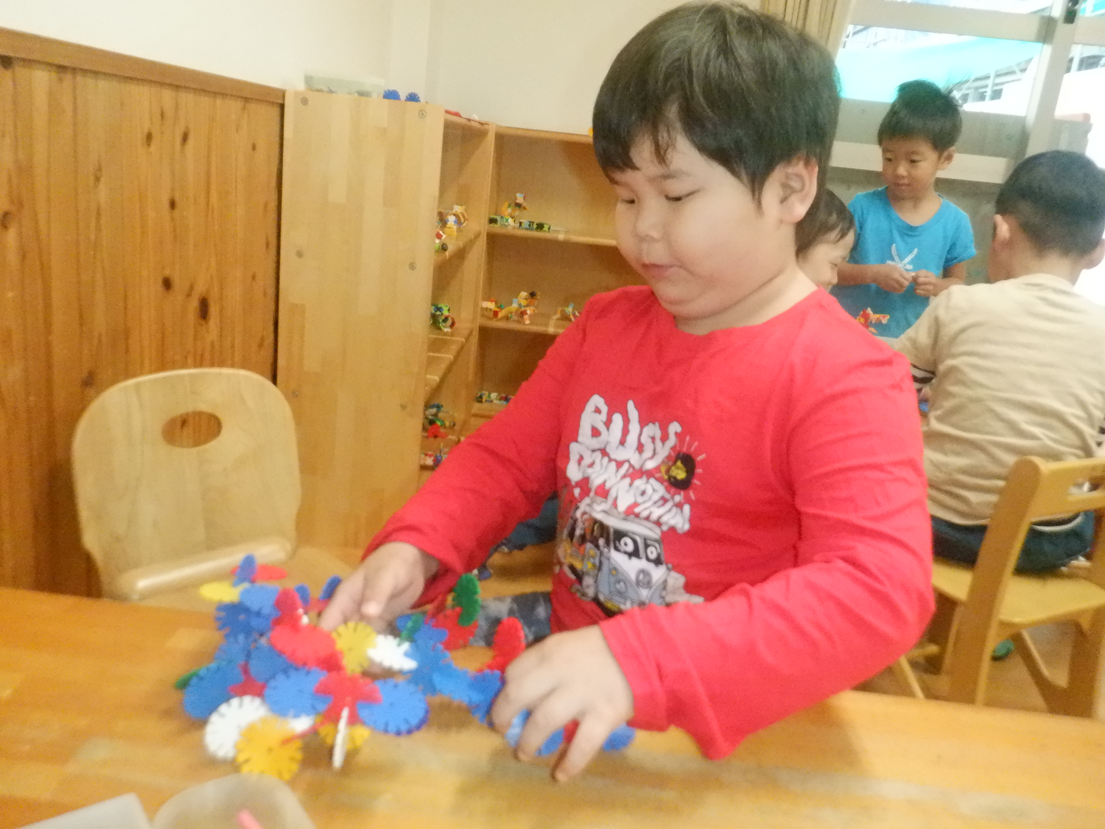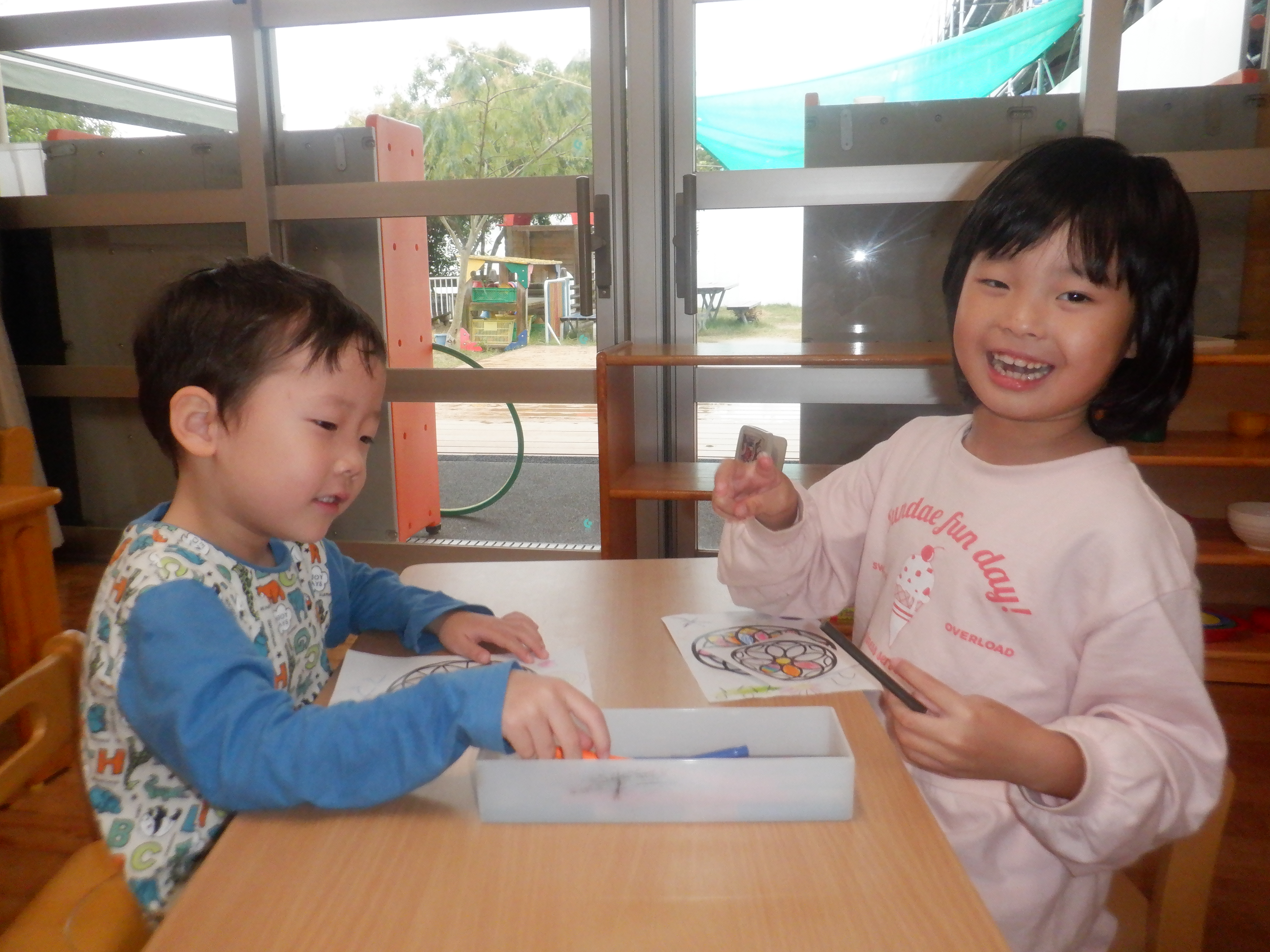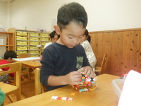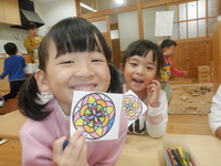 園庭遊びや運動会の練習など、しっかり体を動かした後は、LaQやロンディ、けん玉など室内でじっくりと好きな遊びをしています。まんだら塗り絵を楽しんでいる子は、白い部分が見えないほど、しっかり塗り込んで鮮やかな色合いを出せるようになっています。異年齢同士、ゲームで盛り上がる姿もよく見られます。メモリーカードや国旗かるたで盛り上がっていることが多いです。